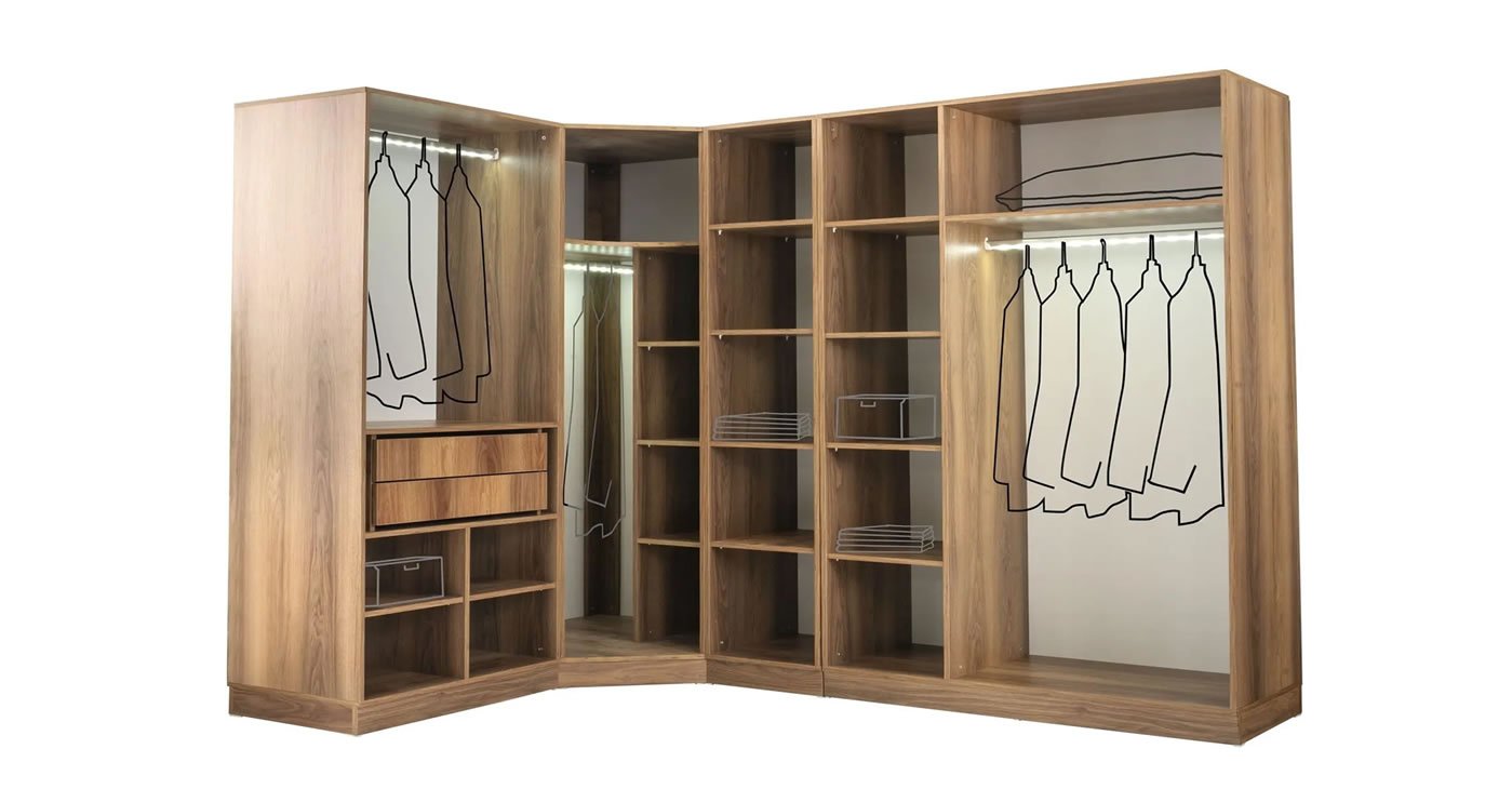 Yatak odası takımımız köşe 6 kapılı gardırop olarak tasarlanmış olup %100 MDF'den üretilmiştir. Bağımsız modüler özelliği ile dolabınızın boyutunu istediğiniz gibi seçebilirsiniz. Modüllerimiz 3 kapılı dolap + köşe dolap + 2 kapılı dolap + 1 kapılı dolap şeklindedir. İsteğe göre modüller eklenebilir veya çıkarılabilir. Yatak odası kapakları membrandır. Dolap kapakları menteşeli frenlidir. Elbise askılarında LED ışıklar bulunmaktadır. Komodin üstündeki panelde ayna ve aplik ışık bulunmaktadır. Dolap aynalı kapaklarında yansıtıcı cam bulunmaktadır.