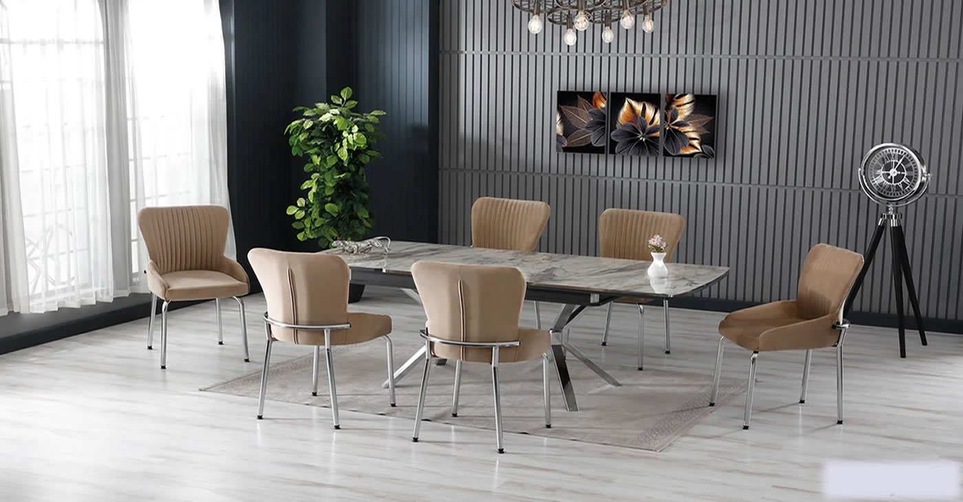 Ürünümüz: MDF Glossmax Tabla Masa, 6 Sandalye dir. Ürün Boyutu: Kapalı 80x130 CM - Açık 175x80 CM | Ürün malzeme detayları resimlerde mevcuttur. Silinebilir babyface kumaş, masa ve sandalye tüm renk seçenekleri mevcuttur. Sandalye ek istenirse adet fiyatı: 4.850 TL dir.